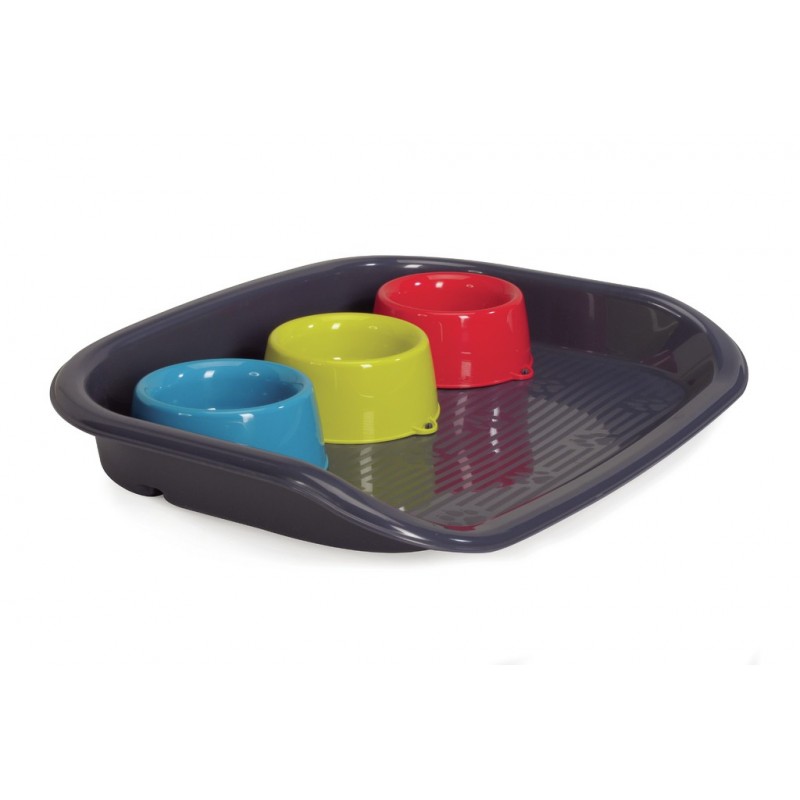 Pratico e funzionale vassoio che contiene 3 ciotole, permettendo di evitare che i residui di cibo e acqua si distribuiscano per la casa.