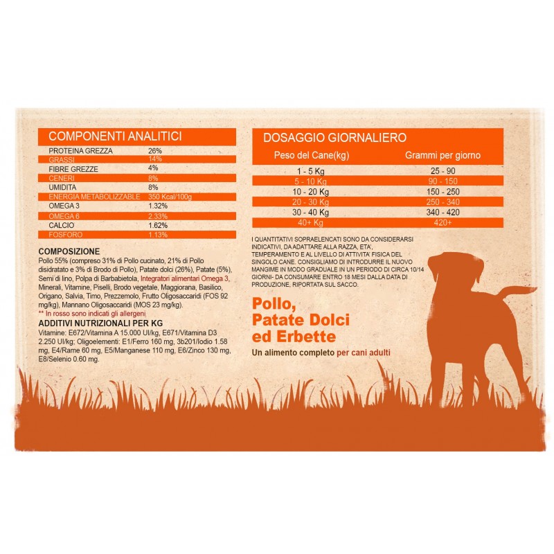 Pollo 55% (compreso 31% di Pollo cucinato, 21% di Pollo disidratato e 3% di Brodo di Pollo), Patate dolci (26%), Patate (5%), Semi di lino, Polpa di Barbabietola, integratori alimentari Omega 3, Minerali, Vitamine, Piselli, Brodo vegetale, Maggiorana, Basilico, Origano, Salvia, Timo, Prezzemolo, Frutto Oligosaccaridi (FOS 92 mg/kg), Mannano Oligosaccaridi (MOS 23 mg/kg).
