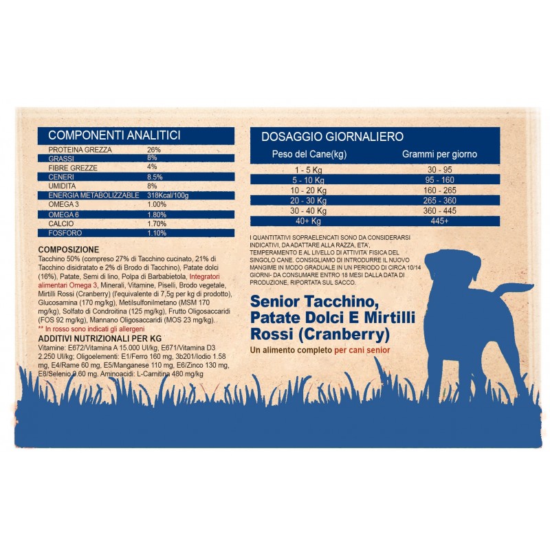 Tacchino 50% (compreso 27% di carne di Tacchino cucinata, 21% di Tacchino disidratato e 2% di Brodo di Tacchino), Patate dolci (16%), Patate, Semi di lino, Polpa diBarbabietola, Integratori alimentari Omega 3, Minerali, Vitamine, Piselli, Brodo vegetale, Mirtilli Rossi (l’equivalente di 7,5 g per chilo di prodotto), Glucosamina (170 mg/kg), Metilsulfonilmetano (170 mg/kg), Solfato di Condroitina (125 mg/kg), Frutto Oligosaccaridi (FOS 92 mg/kg), Mannano Oligosaccaridi (MOS 23 mg/kg).