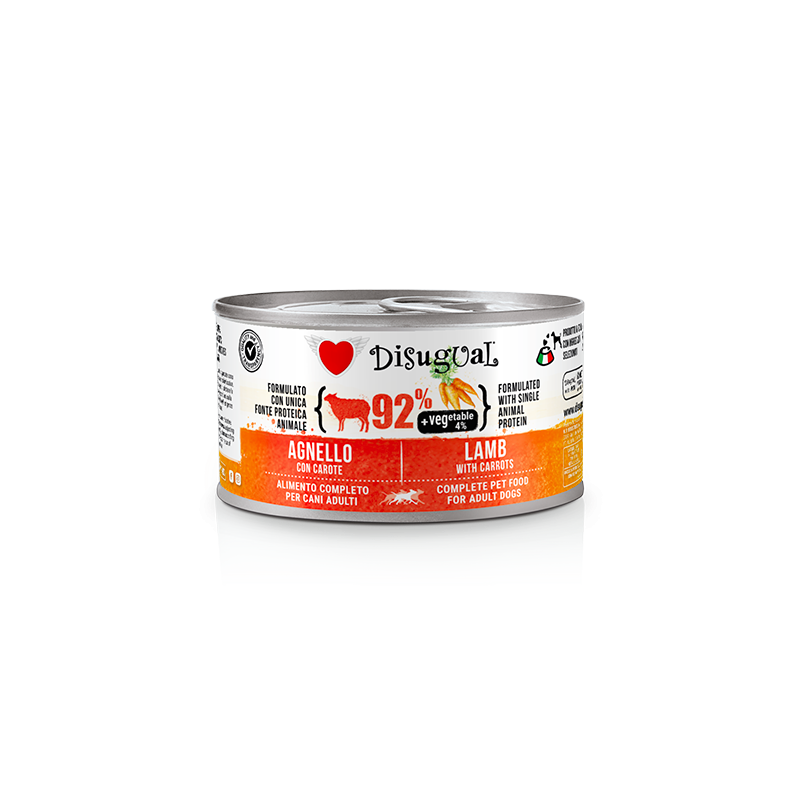Disugual +Vegetable è l'alimento umido completo per il tuo cane adulto, formulato con un'unica fonte proteica animale e arricchito con Ortaggi!