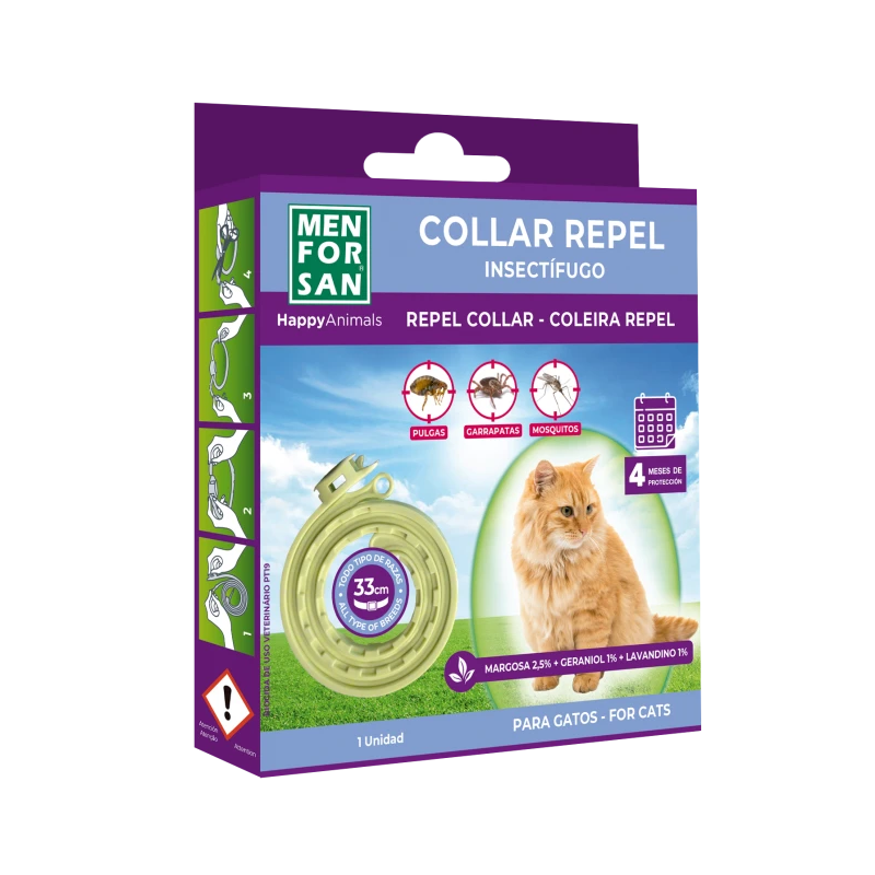 Collare per gatti di alta qualità, con un effetto repellente concentrato. Contiene 3 attivi repellenti naturali (estratto di margose (neem), geraniolo e olio di lavanda) che proteggono dalle infestazioni di parassiti esterni: pulci, zecche, pidocchi, acari e anche dalle punture di zanzara. Realizzato in polimero ipoallergenico di alta qualità e fibbia di sicurezza ergonomica. Può essere utilizzato su gattini dai 3 mesi di età, gatte gravide e gatti allergici agli insetticidi convenzionali. Sostituire il collare dopo tre mesi di utilizzo o in caso di reinfestazione di parassiti